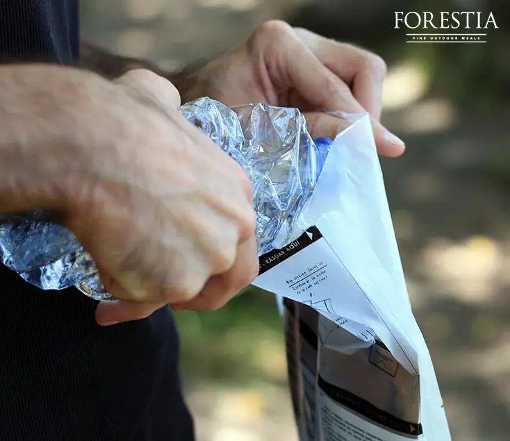 Las raciones de comida Forestia van acompañadas de una bolsa con sistema de auto-calentamiento incorporado. Simplemente deberás meter tu paquete de comida dentro de la bolsa, añadir agua a la bolsa, cerrar, esperar unos minutos… ¡y listo! Ya puedes coger la cuchara y comenzar a disfrutar del paisaje mientras comes.